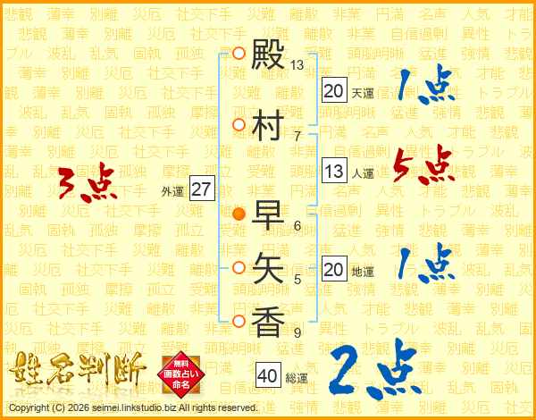 殿(13画)村(7画) 早(6画)矢(5画)香(9画)