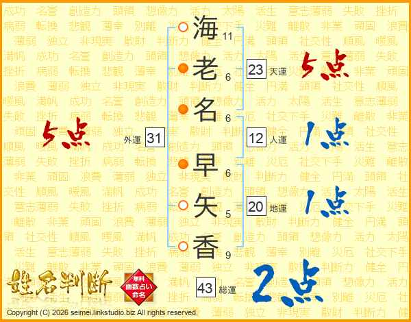 海(11画)老(6画)名(6画) 早(6画)矢(5画)香(9画)