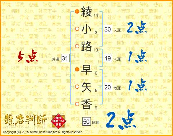 綾(14画)小(3画)路(13画) 早(6画)矢(5画)香(9画)
