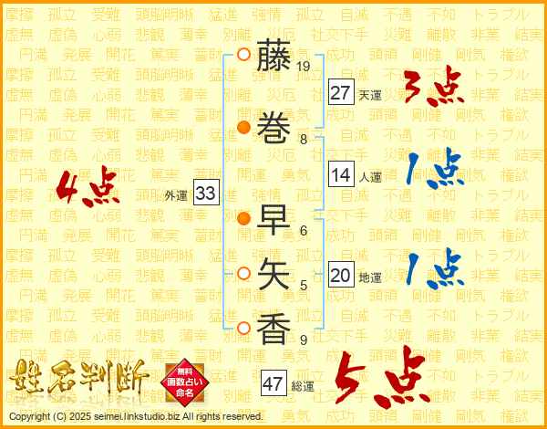 藤(19画)巻(8画) 早(6画)矢(5画)香(9画)