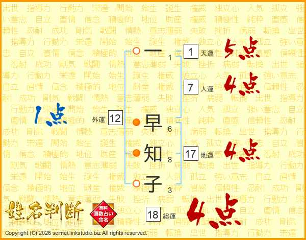 生活面を象徴する運勢です。外部から受ける影響力を表し、結婚運、家庭運や職場、環境への順応性を表します。総運から人運を引いた画数。姓や名が1文字の場合を除く。