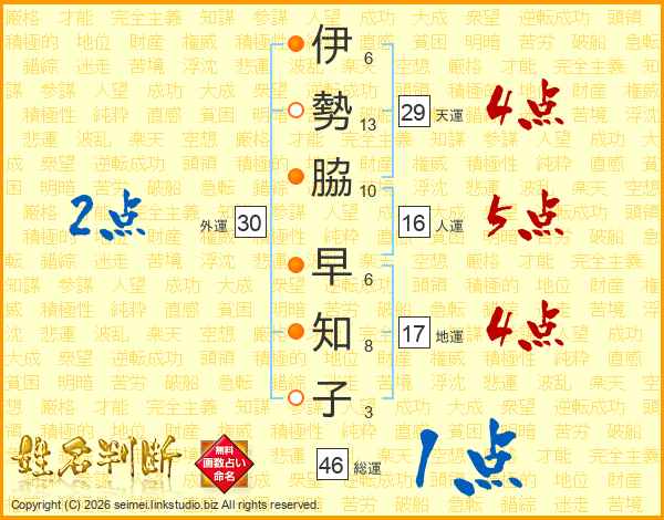 伊(6画)勢(13画)脇(10画) 早(6画)知(8画)子(3画)