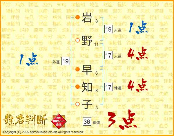 岩(8画)野(11画) 早(6画)知(8画)子(3画)
