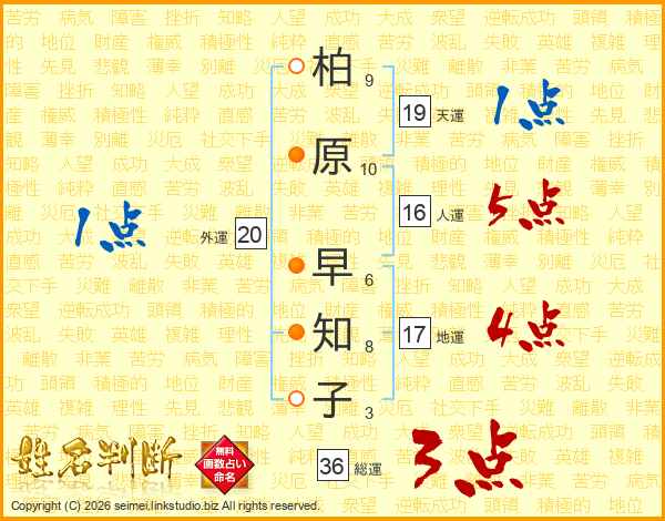 柏(9画)原(10画) 早(6画)知(8画)子(3画)