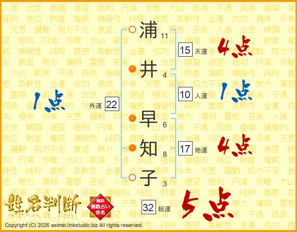 浦(11画)井(4画) 早(6画)知(8画)子(3画)