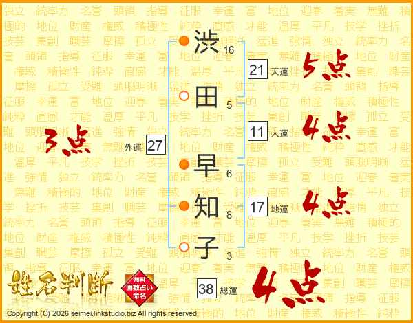 渋田早知子さんの総運は38画の4点!