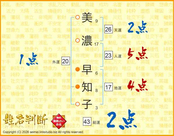 美(9画)濃(17画) 早(6画)知(8画)子(3画)
