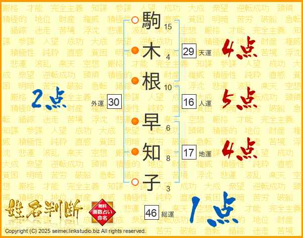 駒(15画)木(4画)根(10画) 早(6画)知(8画)子(3画)