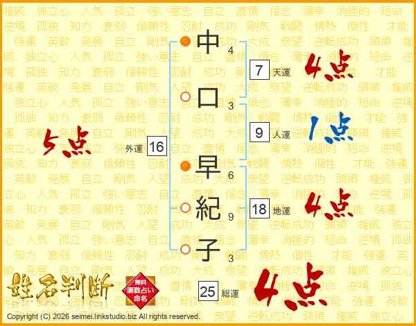 中(4画)口(3画) 早(6画)紀(9画)子(3画)