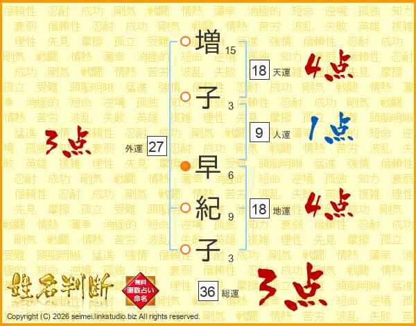 増(15画)子(3画) 早(6画)紀(9画)子(3画)