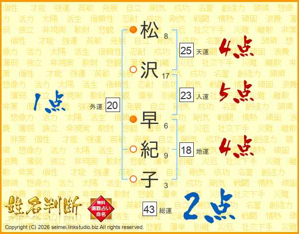 松(8画)沢(17画) 早(6画)紀(9画)子(3画)