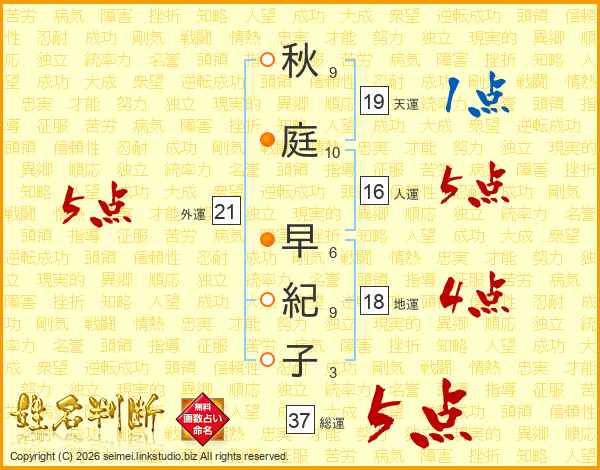 秋(9画)庭(10画) 早(6画)紀(9画)子(3画)