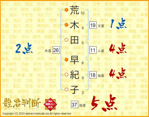 荒(10画)木(4画)田(5画) 早(6画)紀(9画)子(3画)