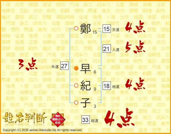 鄭早紀子さんの総運は33画の4点!