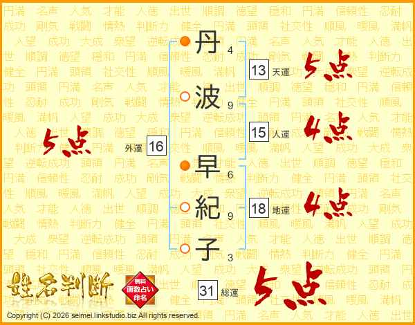 丹(4画)波(9画) 早(6画)紀(9画)子(3画)