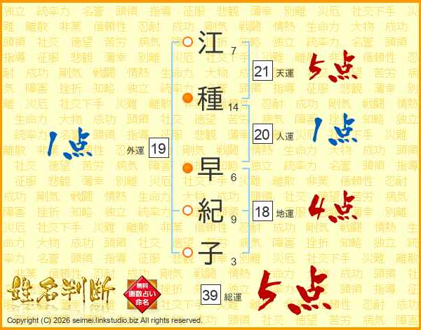 江(7画)種(14画) 早(6画)紀(9画)子(3画)