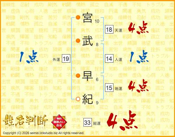 宮(10画)武(8画) 早(6画)紀(9画)