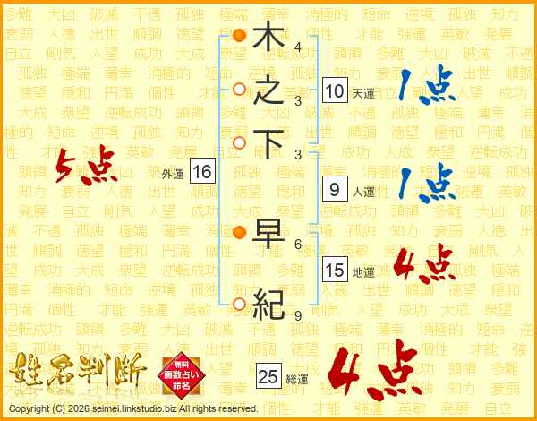 木(4画)之(3画)下(3画) 早(6画)紀(9画)
