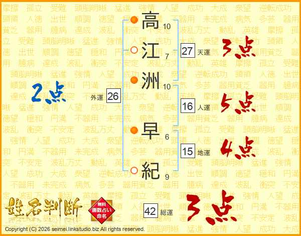 高(10画)江(7画)洲(10画) 早(6画)紀(9画)