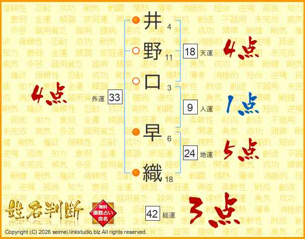 井(4画)野(11画)口(3画) 早(6画)織(18画)