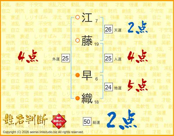 生活面を象徴する運勢です。外部から受ける影響力を表し、結婚運、家庭運や職場、環境への順応性を表します。総運から人運を引いた画数。姓や名が1文字の場合を除く。