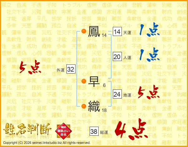 生活面を象徴する運勢です。外部から受ける影響力を表し、結婚運、家庭運や職場、環境への順応性を表します。総運から人運を引いた画数。姓や名が1文字の場合を除く。
