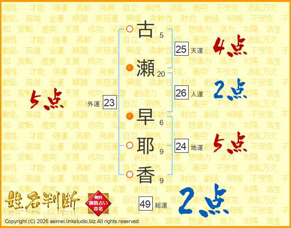 古(5画)瀬(20画) 早(6画)耶(9画)香(9画)