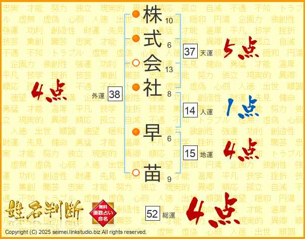 株(10画)式(6画)会(13画)社(8画) 早(6画)苗(9画)