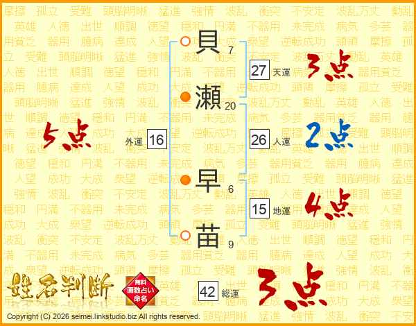 貝(7画)瀬(20画) 早(6画)苗(9画)