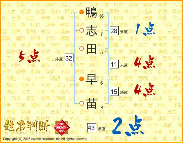 鴨(16画)志(7画)田(5画) 早(6画)苗(9画)