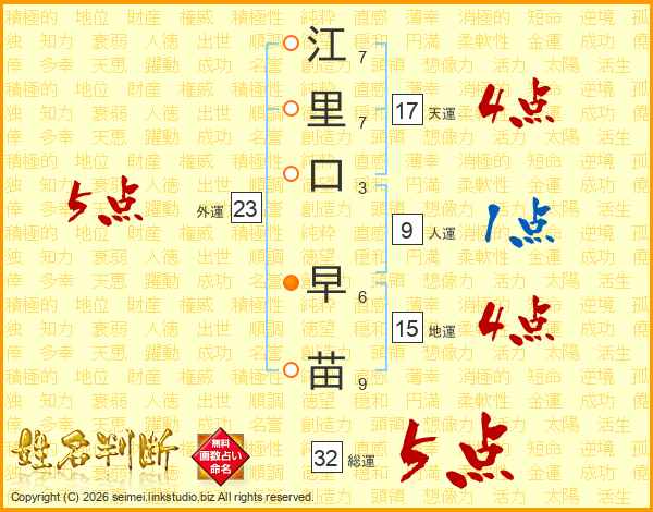 生活面を象徴する運勢です。外部から受ける影響力を表し、結婚運、家庭運や職場、環境への順応性を表します。総運から人運を引いた画数。姓や名が1文字の場合を除く。
