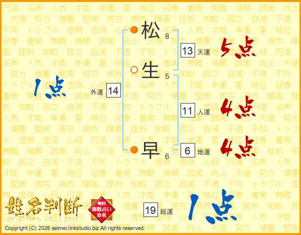 生活面を象徴する運勢です。外部から受ける影響力を表し、結婚運、家庭運や職場、環境への順応性を表します。総運から人運を引いた画数。姓や名が1文字の場合を除く。