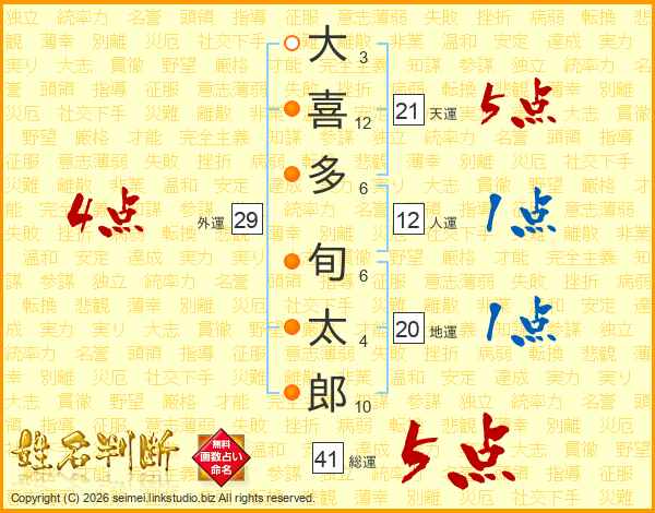 大(3画)喜(12画)多(6画) 旬(6画)太(4画)郎(10画)