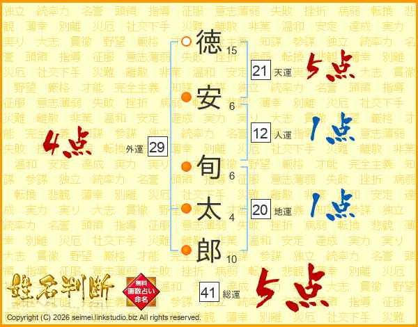 徳安旬太郎さんの総運は41画の5点!