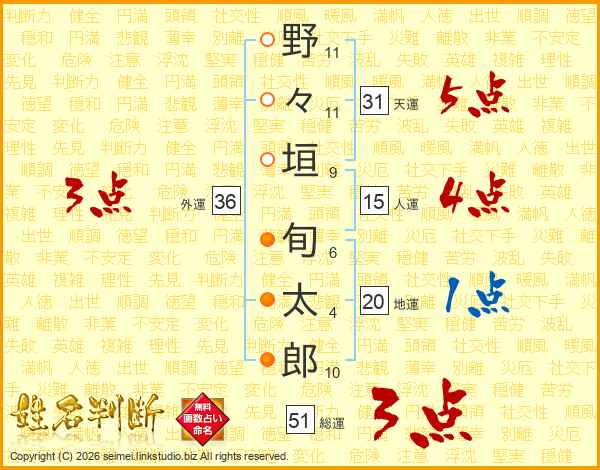 野(11画)々(11画)垣(9画) 旬(6画)太(4画)郎(10画)
