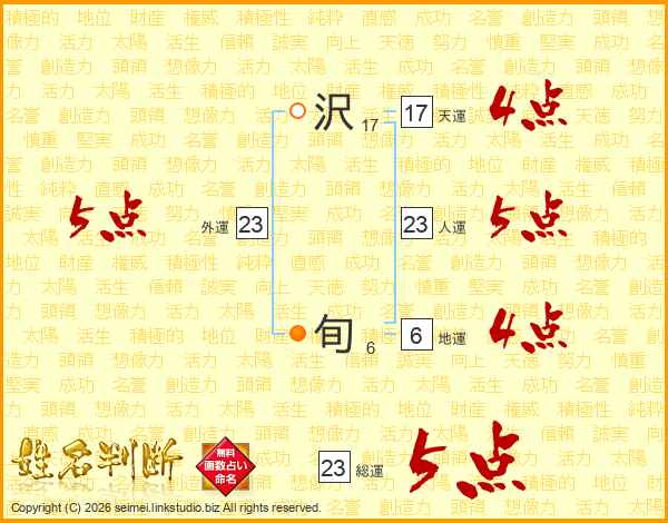 生活面を象徴する運勢です。外部から受ける影響力を表し、結婚運、家庭運や職場、環境への順応性を表します。総運から人運を引いた画数。姓や名が1文字の場合を除く。