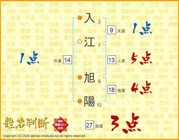 生活面を象徴する運勢です。外部から受ける影響力を表し、結婚運、家庭運や職場、環境への順応性を表します。総運から人運を引いた画数。姓や名が1文字の場合を除く。