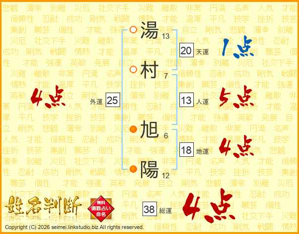 湯(13画)村(7画) 旭(6画)陽(12画)