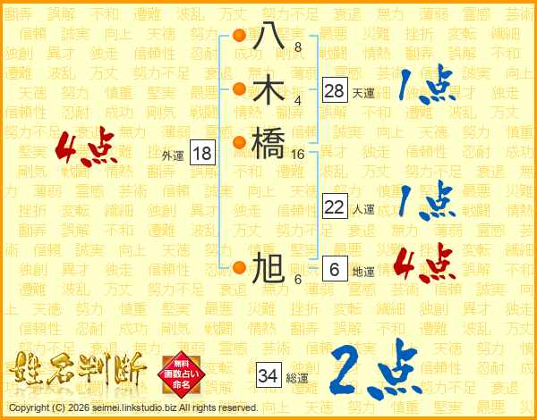 あなたの人生を表す1番重要な運勢です。生涯を通じて影響する総合運となり、主に50歳以降の晩年期に影響を及ぼします。苗字と名前の合計画数。