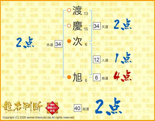 渡(13画)慶(15画)次(6画) 旭(6画)