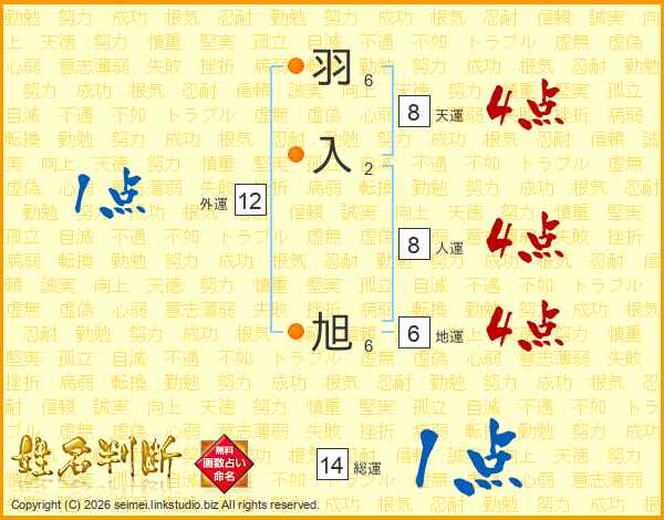 生活面を象徴する運勢です。外部から受ける影響力を表し、結婚運、家庭運や職場、環境への順応性を表します。総運から人運を引いた画数。姓や名が1文字の場合を除く。