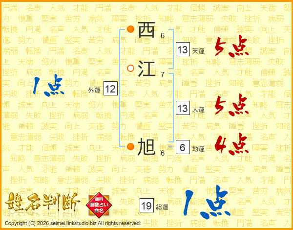 生活面を象徴する運勢です。外部から受ける影響力を表し、結婚運、家庭運や職場、環境への順応性を表します。総運から人運を引いた画数。姓や名が1文字の場合を除く。