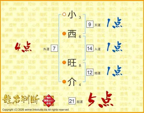 小西旺介さんの総運は21画の5点!