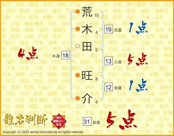 荒(10画)木(4画)田(5画) 旺(8画)介(4画)