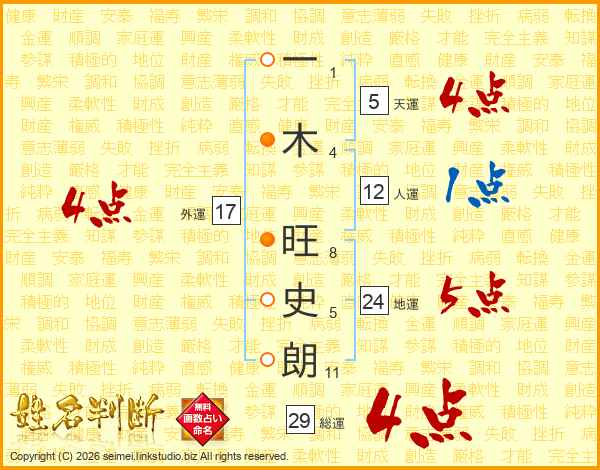 一(1画)木(4画) 旺(8画)史(5画)朗(11画)