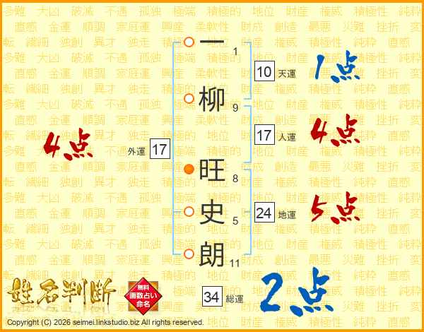 一(1画)柳(9画) 旺(8画)史(5画)朗(11画)