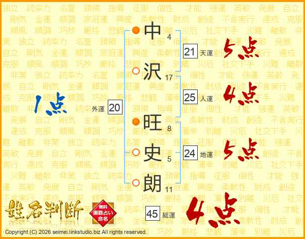 中(4画)沢(17画) 旺(8画)史(5画)朗(11画)
