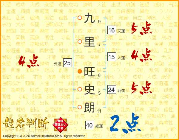 九(9画)里(7画) 旺(8画)史(5画)朗(11画)