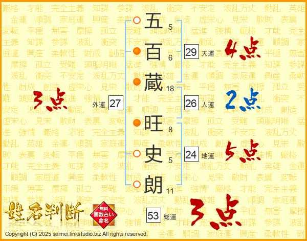 五(5画)百(6画)蔵(18画) 旺(8画)史(5画)朗(11画)