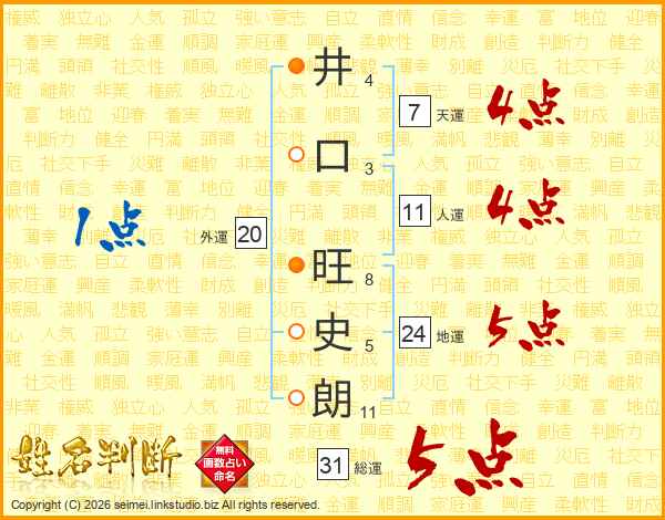 井(4画)口(3画) 旺(8画)史(5画)朗(11画)